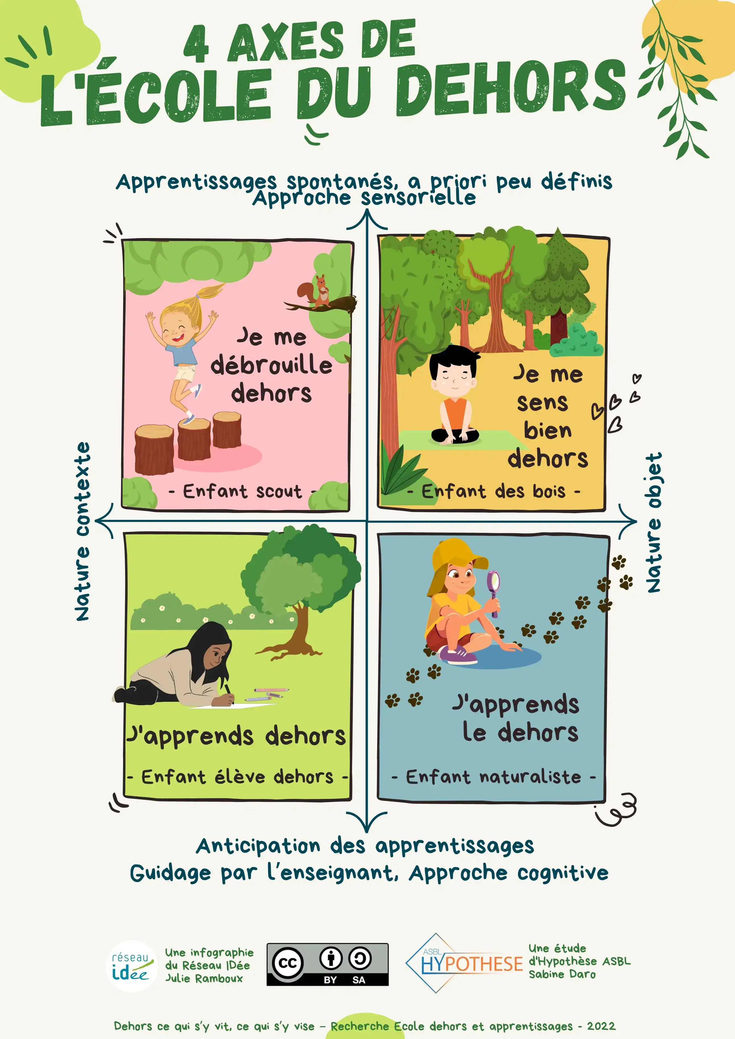 Les activités libres dans la nature, contrairement aux activités d'apprentissages visant des compétences disciplinaires précises, permettent de développer des compétences transversales instrumentales, relationnelles, des compétences émotionnelles, sensorielles, affectives, imaginaires... Le rôle de l'enseignant est alors d'accompagner les enfants (écoute, suggestion d'activités...). Les rituels (contes, chansons...) mis en place lors des sorties Ecole du dehors permettent d'amplifier ce sentiment de bien-être.